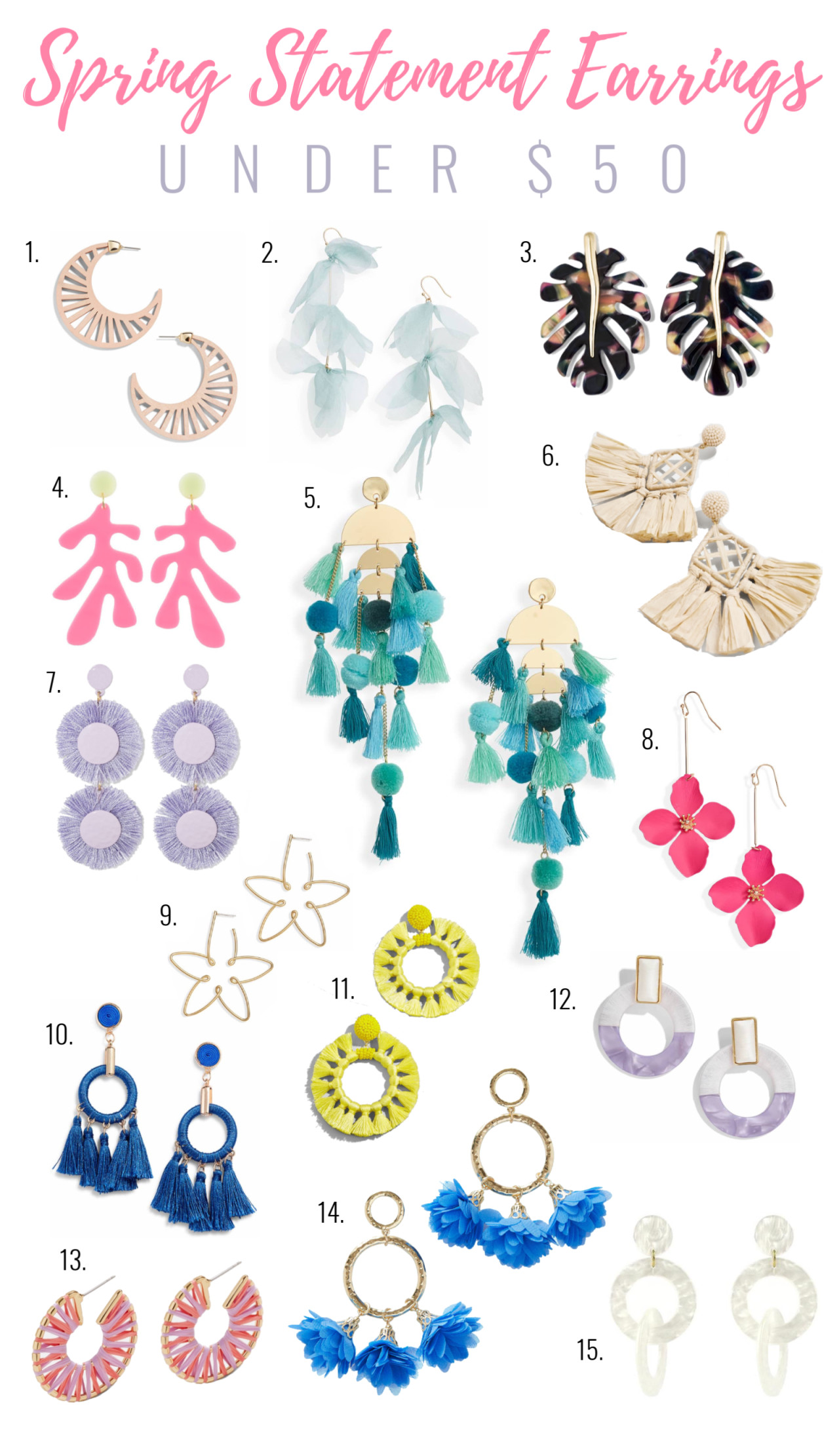 It’s no secret that I’m a huge fan of statement earrings and I’m an even bigger fan when I can score them for a deal! Today I’m sharing a big roundup of my favorite statement earrings for spring and how you can stay on trend without breaking the bank. All of these pieces are under $50 and you can click on any of the images below to shop!